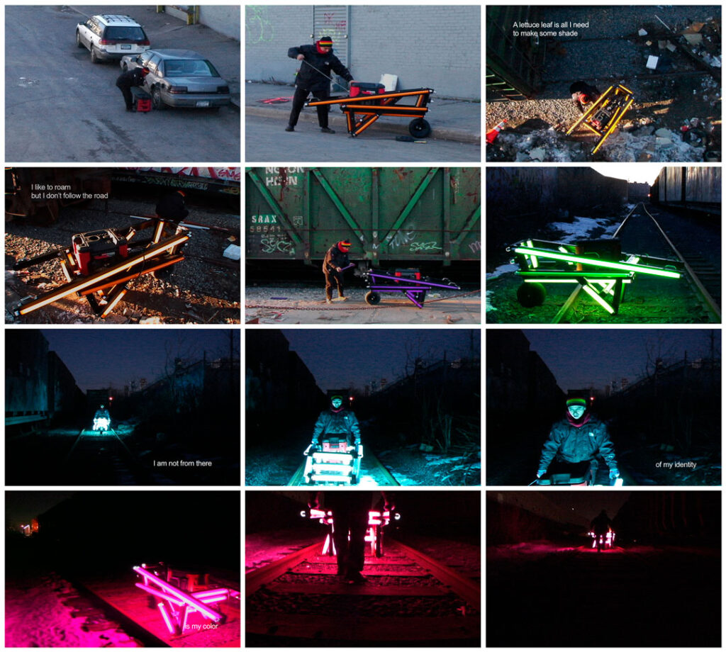 Formato: Tubos fluorescentes, metal, rueda y energía eléctrica, 86.4 x 193 x 86.4 y video 8’