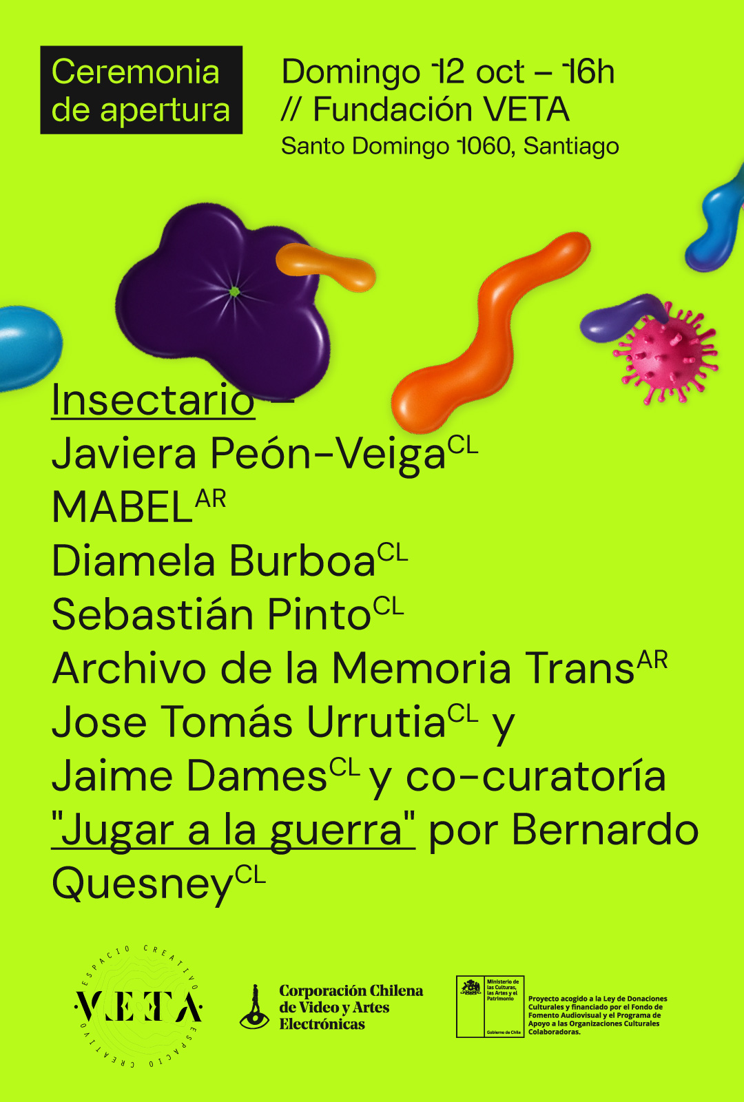 El domingo 12 de octubre, a las 16:00 h. en Fundación VETA (Santo Domingo 1060, Santiago), se dará apertura a la muestra "Insectario", que bajo la curatoría de Nicolás Oyarce reúne las obras de MaBEL (AR), Diamela Burboa (CL), Sebastián Pinto (CL), Archivo de la Memoria Trans Argentina (AR) y la co-curatoría "Jugar a la […]
