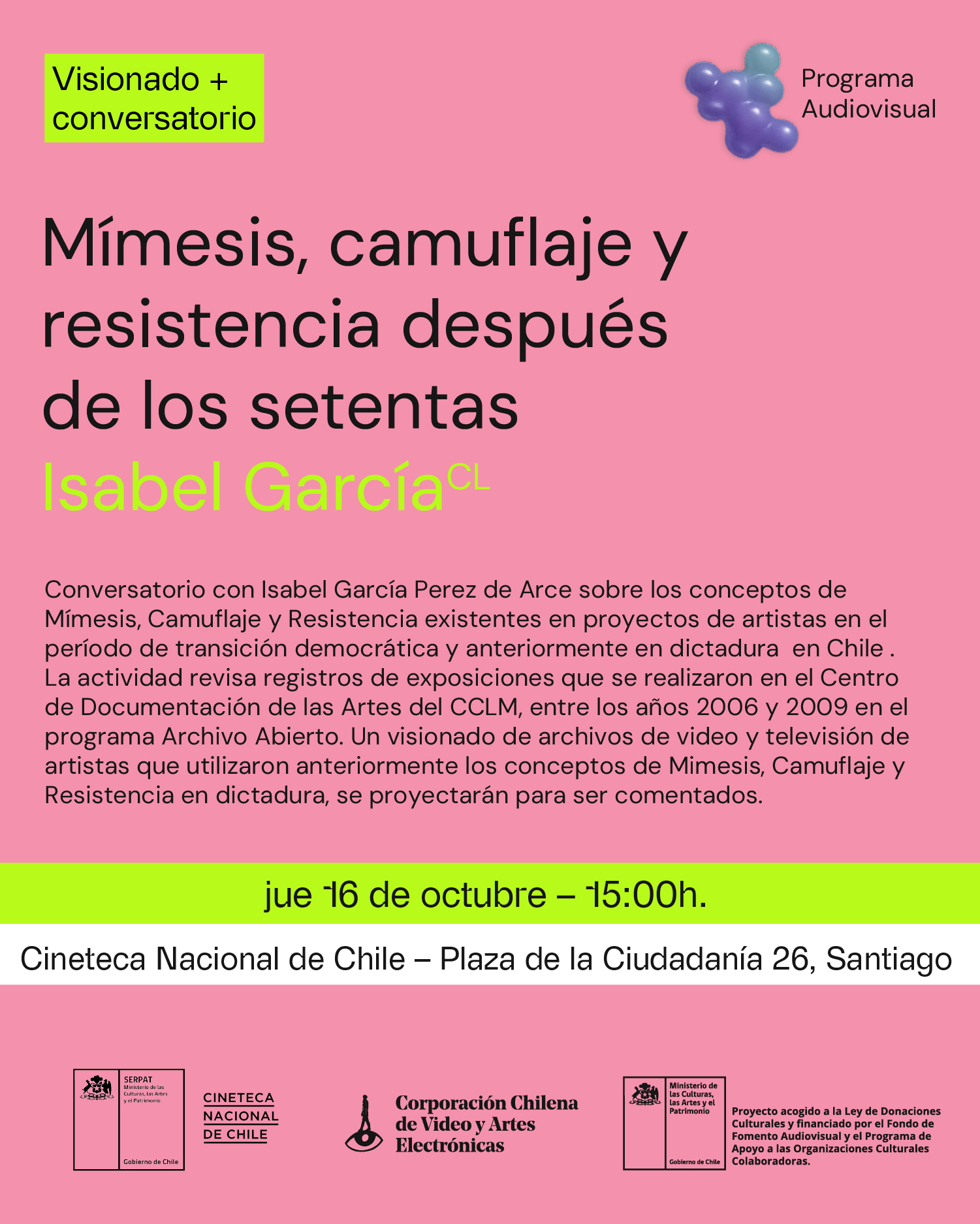 Conversatorio con Isabel García Perez de Arce sobre los conceptos de Mímesis, Camuflaje y Resistencia existentes en proyectos de artistas en el período de transición democrática y anteriormente en dictadura en Chile. La actividad revisa registros de exposiciones que se realizaron en el Centro de Documentación de las Artes del CCLM, entre los años 2006 […]