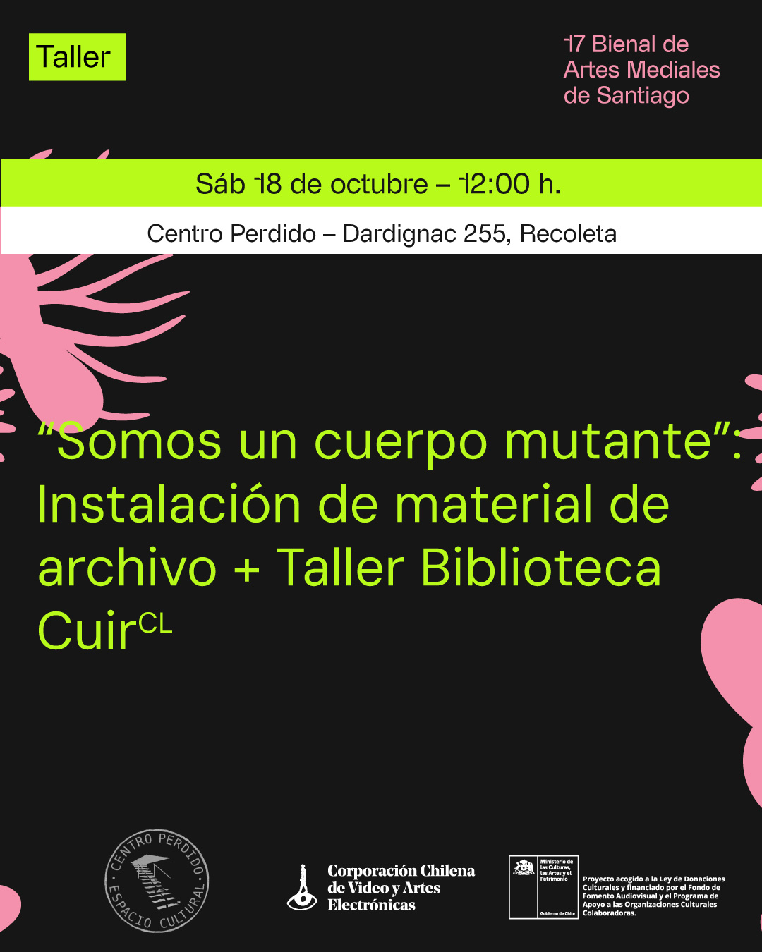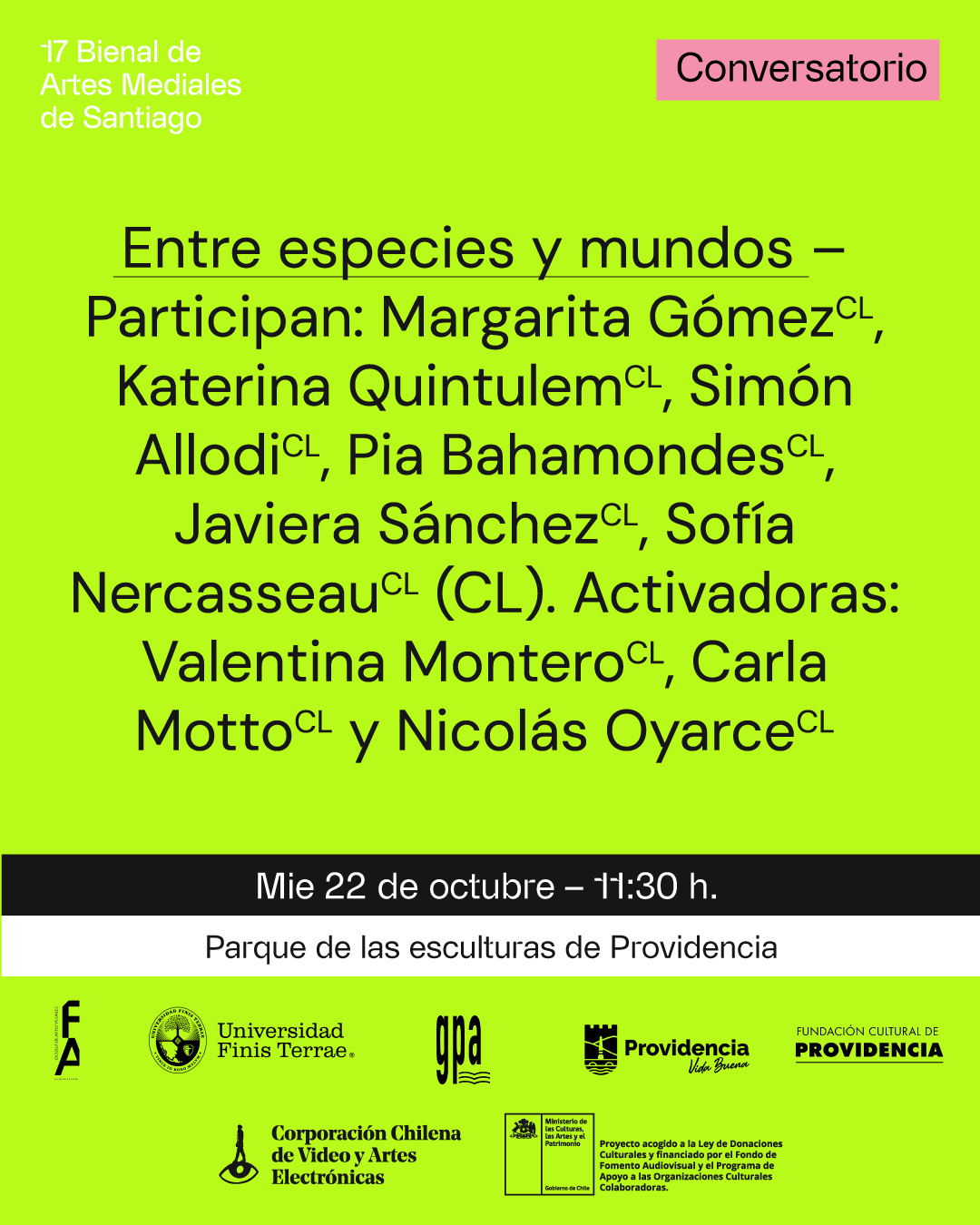 Conversatorio que pondrá en relación la curatoría de la 17 BAM: «Hiperrrealidades» con la exposición Cruzar el tiempo. En estas instancias, participarán artistas que forman parte de Cruzar el tiempo, sus curadoras y un representante de la 17 BAM. Participan: Margarita Gómez, Katerina Quintulem, Simón Allodi, Pia Bahamondes, Javiera Sánchez, Sofía Nercasseau Activadoras: Valentina Montero […]