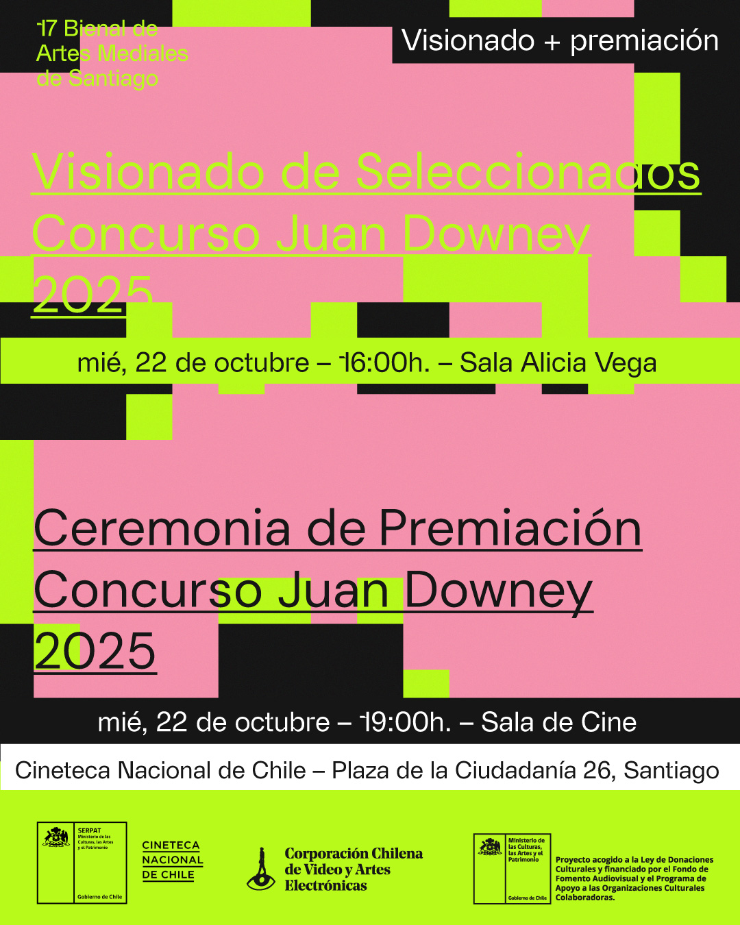 El miércoles 22 de octubre a las 16:00 horas en Sala Alicia Vega de la Cineteca Nacional (Pl. de la Ciudadanía 26, Santiago), se realizará el Visionado de la Selección "Concurso Juan Downey 2025" y a las 19:00 horas la posterior premiación en Cineteca. El certamen rinde homenaje al pionero del videoarte Juan Downey y celebra nuevas […]