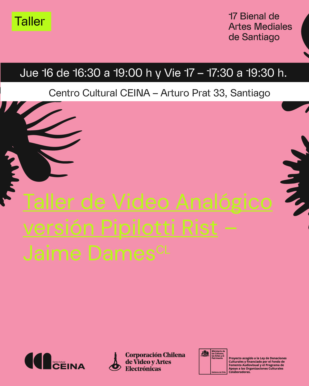 El Taller de Video Analógico versión Pipilotti Rist, realizado por Jaime Dames (CL) tiene como propósito reconocer y analizar elementos técnicos y estéticos utilizados por la artista en la producción de video arte. Las y los participantes podrán reconocer las técnicas de luma key y croma key en formatos análogos y los equipos necesarios para […]