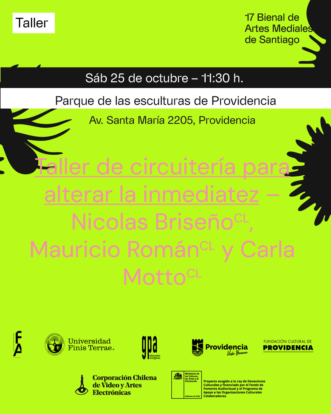 Este taller propone una aproximación lúdica y creativa a la electrónica básica mediante la creación, alteración y reconfiguración de dispositivos interactivos. A través de experimentos con distintas fuentes de energía y componentes como resistencias, potenciómetros, leds y sensores, se invita a manipular la electricidad en tanto materia expresiva. La propuesta busca intervenir la inmediatez del […]
